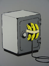 Monkey detonator by the West Country Prince is a fantastic new screen print capturing Banksy's mischievous Monkey trying to blow a safe using his trademark bananas.