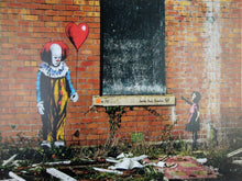For this particular print JPS has used the Tim Curry era Pennywise Clown from the 1990 film version of IT, and The Banksy's girl reaching in hope for her balloon. Will Pennywise give it back?